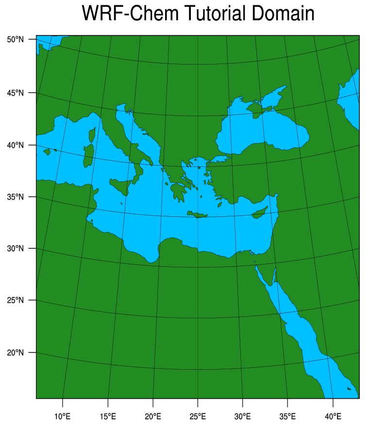 Using the WPS, build a single WRF domain with a Lambert Conformal projection using geogrid.exe. The simulation will will use 6 h GFS analysis data starting on 14 July 2010 and ending on 19 July 2010. The domain should be (41, 41) grid points in size and use 100 km grid spacing. Center the domain at 35 degrees north and 25 degrees east. Your namelist.wps should have settings as follows: